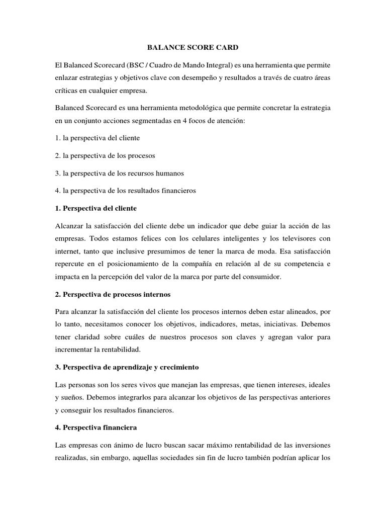 El concepto de Balance Scorcard o también conocido BSC, tablero de mando o cuadro de