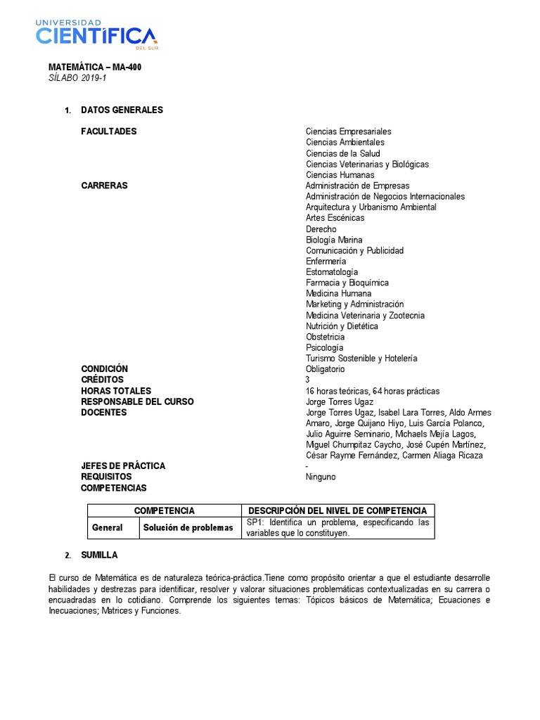El curso de Matemática es de naturaleza teórica-práctica.Tiene como propósito orientar a que el estudiante desarrolle