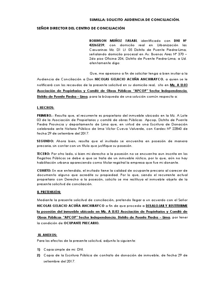 SUMILLA: SOLICITO AUDIENCIA DE CONCILIACIÓN.