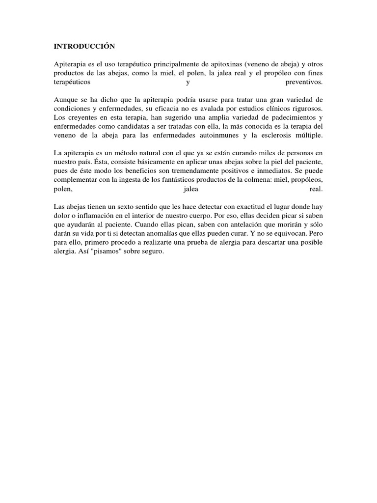 de abeja. Si reacciona, no es recomendable que siga el tratamiento. Las terapias