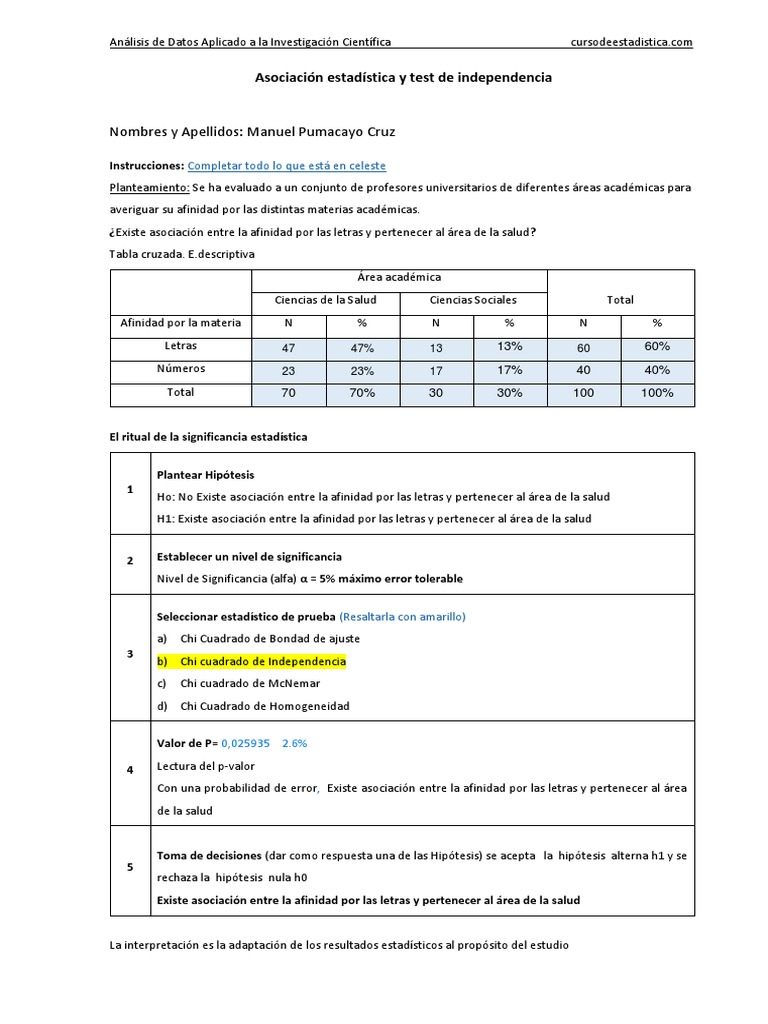 Seleccionar estadístico de prueba (Resaltarla con amarillo)