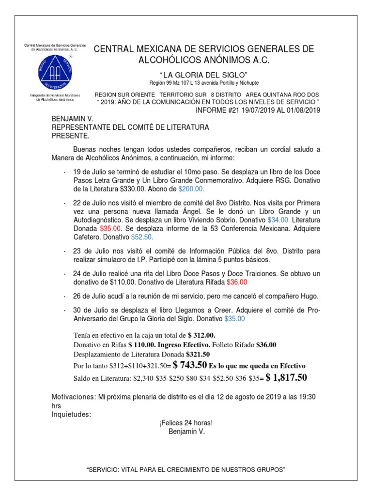 Manera de Alcohólicos Anónimos, a continuación, mi informe: