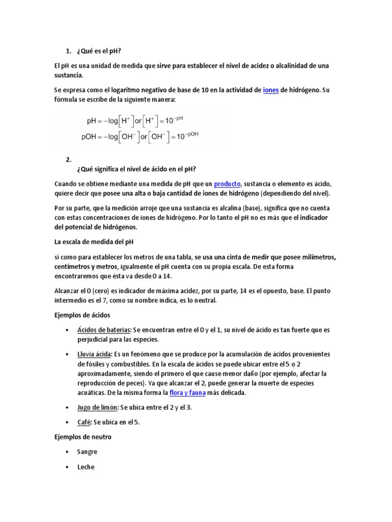 Se expresa como el logaritmo negativo de base de 10 en la actividad de iones de hidrógeno. Su