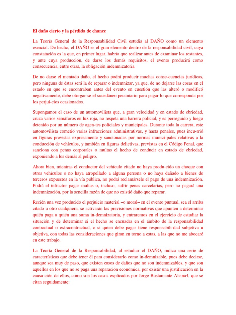La "pérdida de chance" constituye un daño cierto y resarcible cuando la chance tenía una expectativa razonable de producirse y fue frustrada directa y exclusivamente por el evento dañoso, sin la posibilidad de que se hubiera frustrado posteriormente por otros motivos. Un ejemplo es el caso del caballo de carreras que pierde la posibilidad de competir por culpa del transporte fallido, lo que se considera una chance con expectativa razonable y cuya frustración es directamente atribuible al evento dañoso .