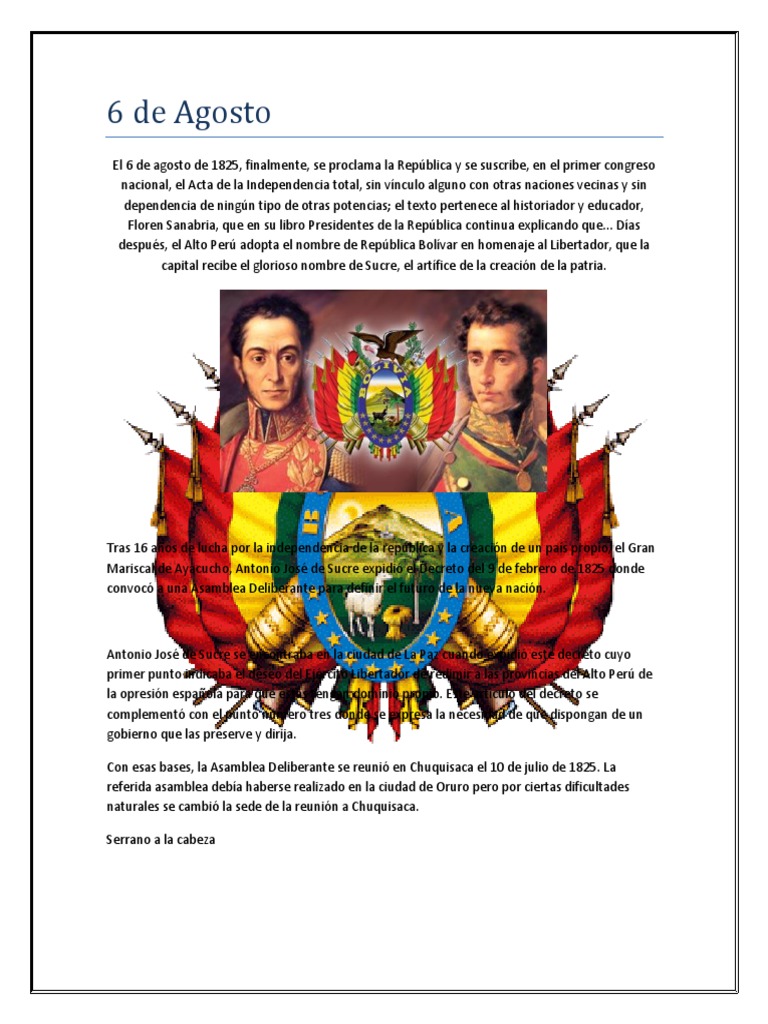 obra, la dramática insurgencia de Bolivia: "El sábado 6 de agosto de 1825, Bolivia comenzó su vida