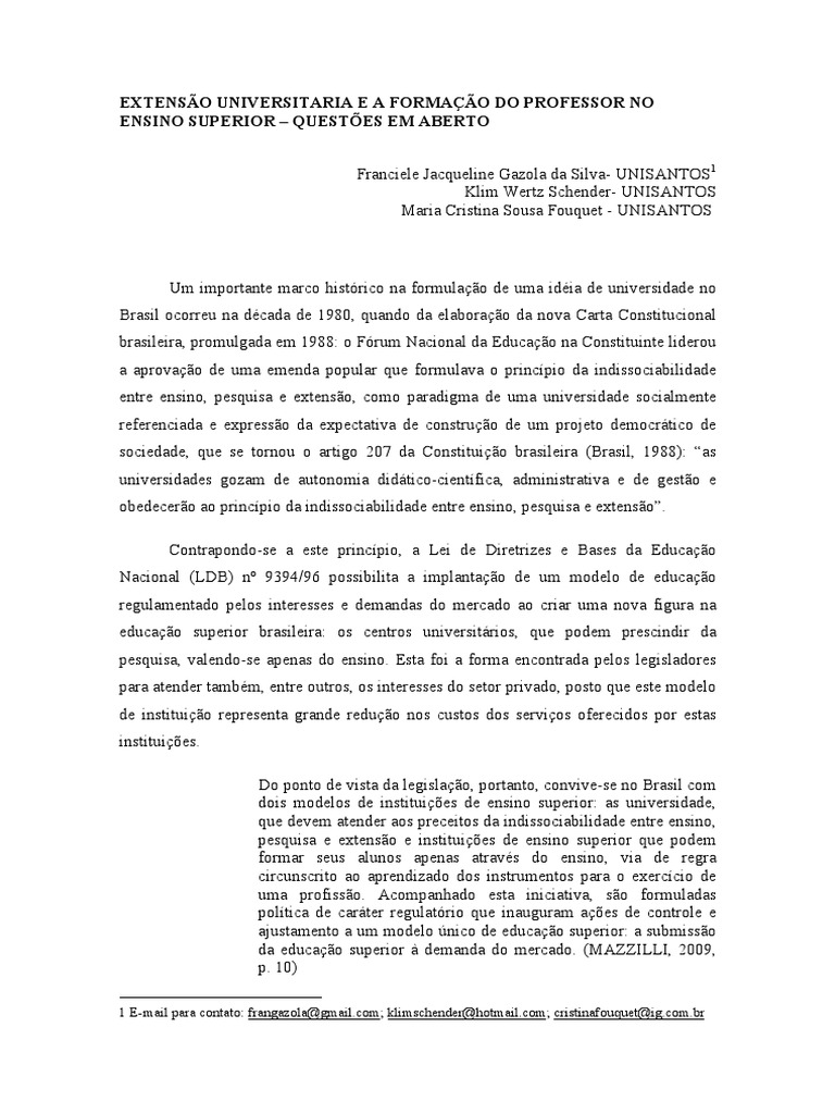 Vieira Pinto e Paulo Freire e das atividades de educação popular realizadas pela União Nacional dos Estudantes - UNE, na década de 60; já a incorporação do principio da indissociabilidade na Constituição Federal tem estreita relação com a disputa da sociedade pela educação publica e socialmente referenciada, que no ensino superior brasileiro teve como ator social fundamental a ANDES – Associação Nacional dos Docentes do Ensino Superior, que sistematiza no início da década de 80 um projeto de universidade que tem como premissa a consolidação de uma escola pública, gratuita para toda a população e referenciada em critérios como autonomia universitária e gestão democrática, aliados ao compromisso do Estado com o seu financiamento, apontando para a construção de um padrão unitário de qualidade para a universidade brasileira – e a associação entre ensino, pesquisa e extensão é justamente o critério pelo qual esta concepção de qualidade se orienta.
