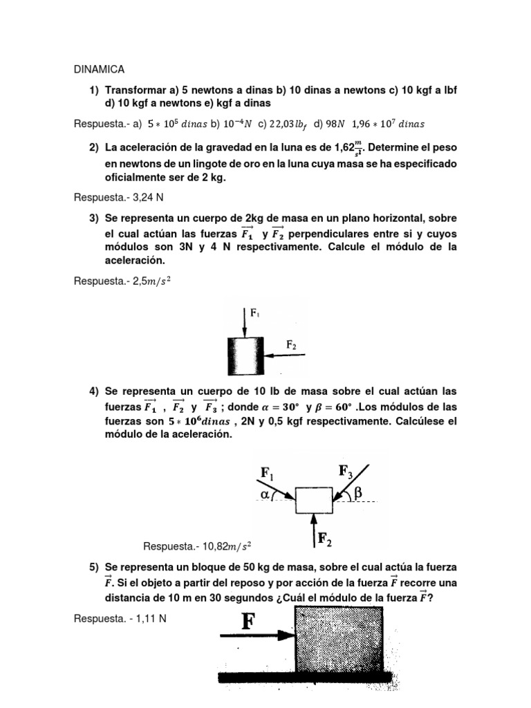1) Transformar a) 5 newtons a dinas b) 10 dinas a newtons c) 10 kgf a lbf