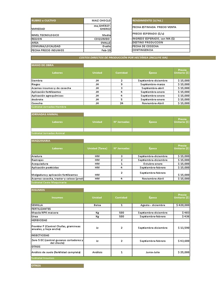 2. Precio de Insumos corresponde a precios colocados en el predio