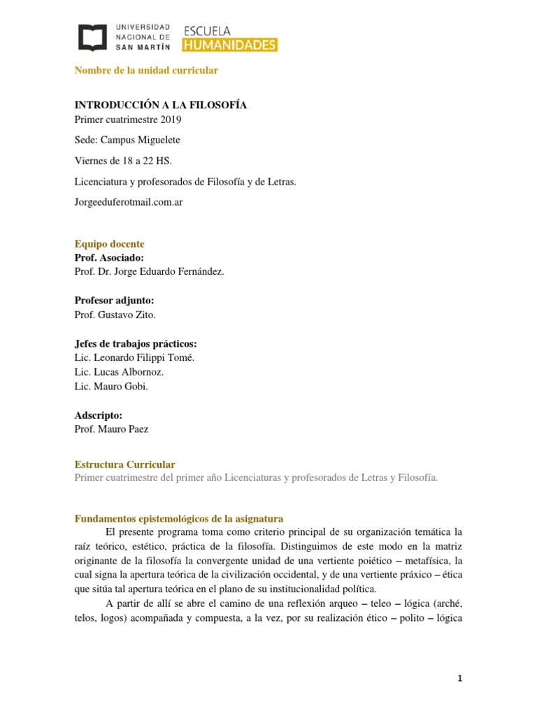 la filosofía contemporánea. Al respecto el programa incluye, entre otras, Renato Descartes,