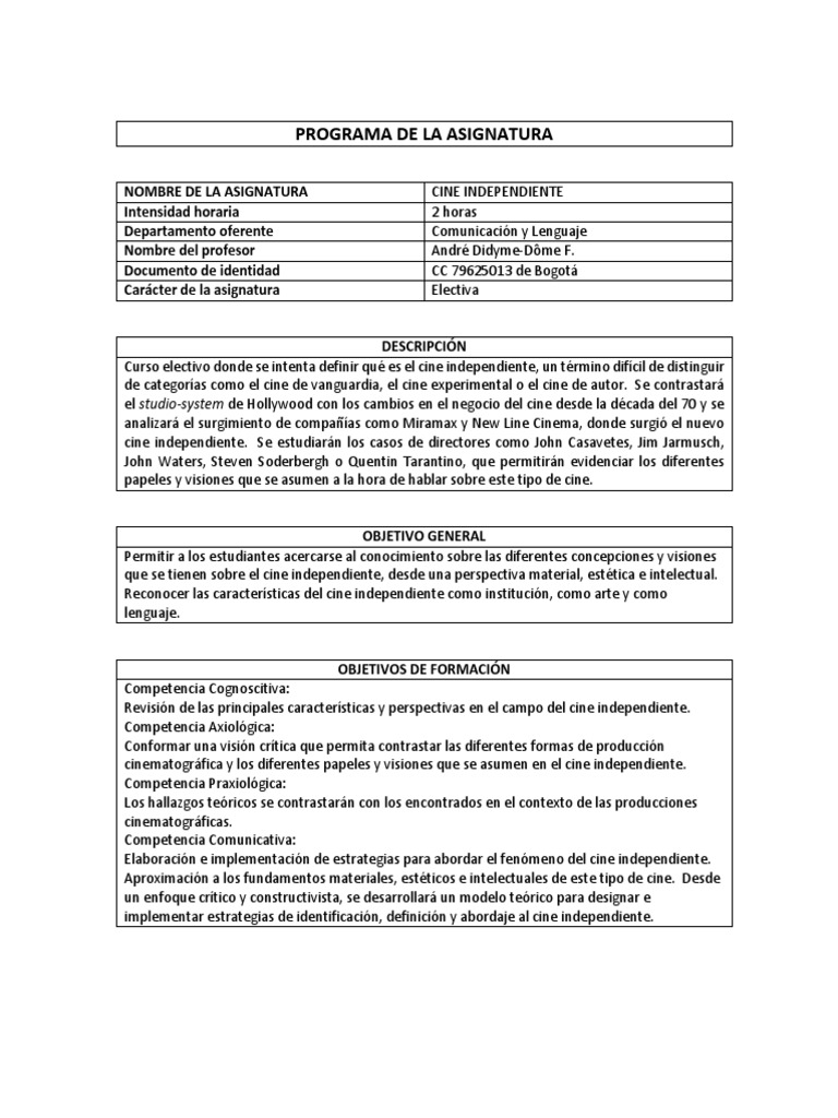 NOMBRE DE LA ASIGNATURA CINE INDEPENDIENTE
