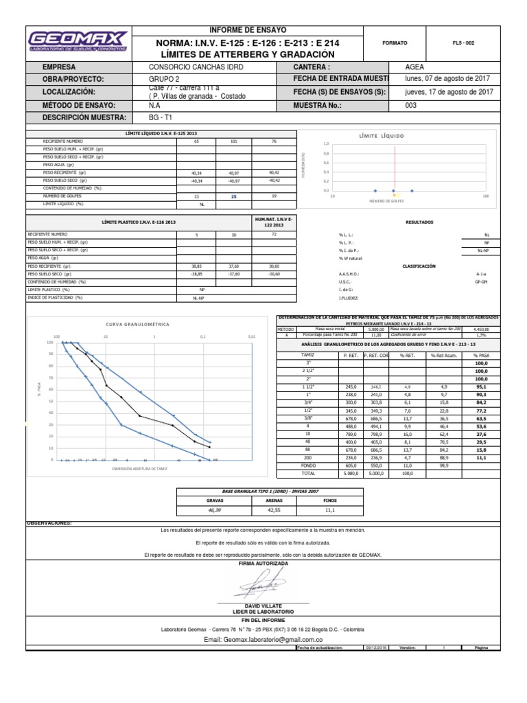 LOCALIZACIÓN: Calle 77 - carrera 111 a ( P. VILLAS DE GRANADA ) FECHA (S) DE ENSAYOS (S): jueves, 17 de agosto de 2017