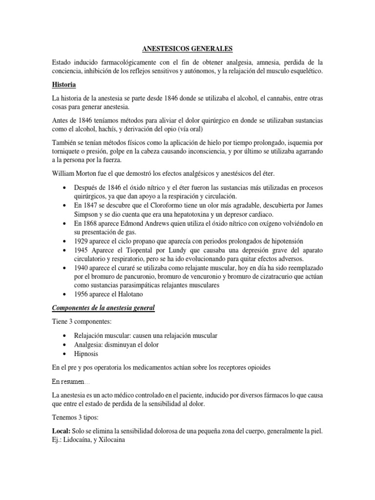 La historia de la anestesia se parte desde 1846 donde se utilizaba el alcohol, el cannabis, entre otras