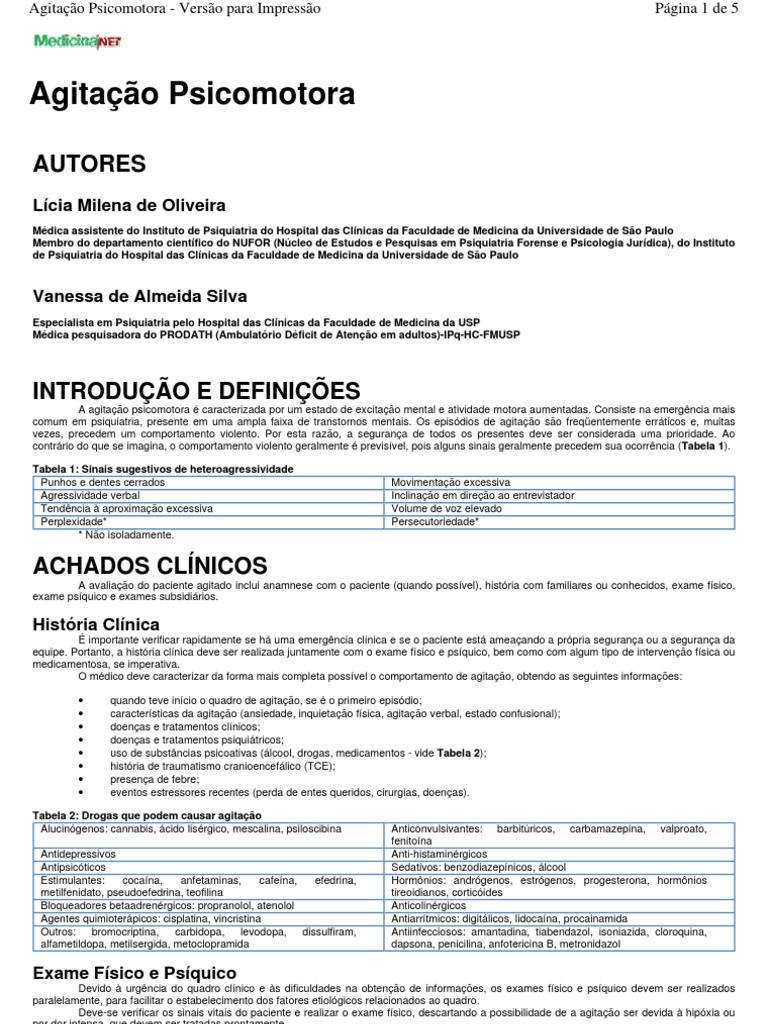 comum em psiquiatria, presente em uma ampla faixa de transtornos mentais. Os episódios de agitação são freqüentemente erráticos e, muitas vezes, precedem um comportamento violento. Por esta razão, a segurança de todos os presentes deve ser considerada uma prioridade. Ao contrário do que se imagina, o comportamento violento geralmente é previsível, pois alguns sinais geralmente precedem sua ocorrência (Tabela 1).