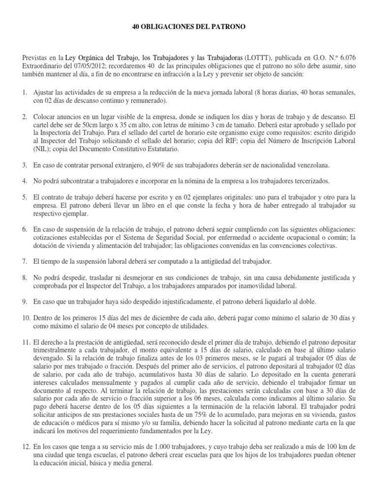 Extraordinario del 07/05/2012; recordaremos 40 de las principales obligaciones que el patrono no sólo debe asumir, sino