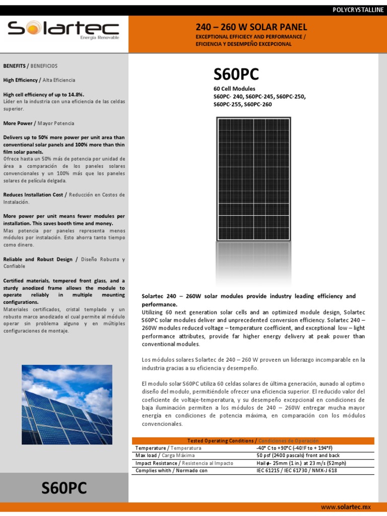 S60PC solar modules deliver and unprecedented conversion efficiency. Solartec 240 –
