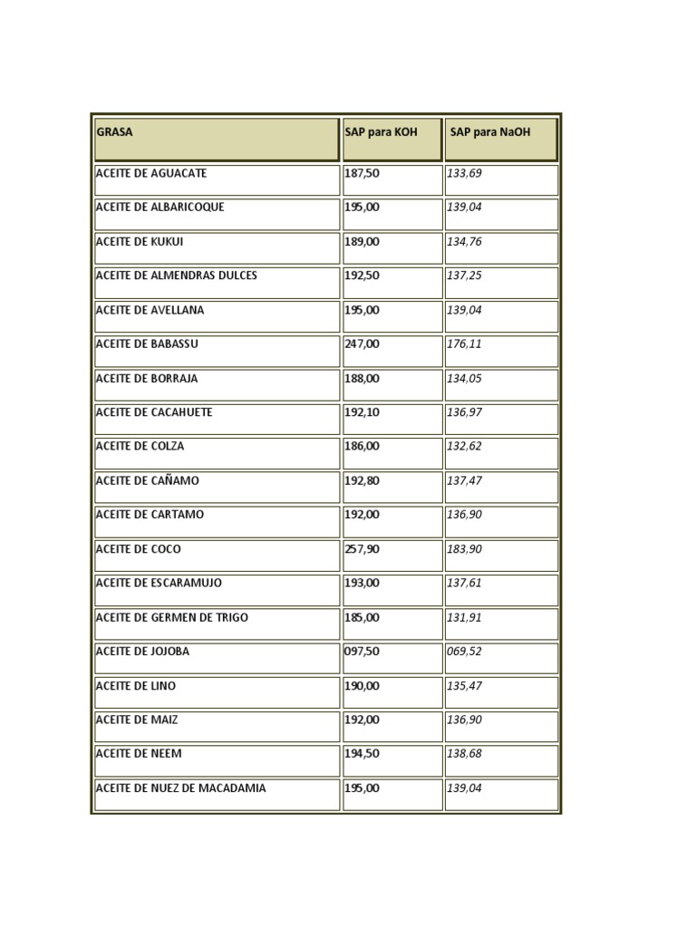 La tabla de saponificación es necesaria para hacer los cálculos para la elaboración del