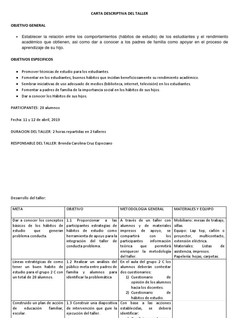 RESPONSABLE DEL TALLER: Brenda Carolina Cruz Especiano