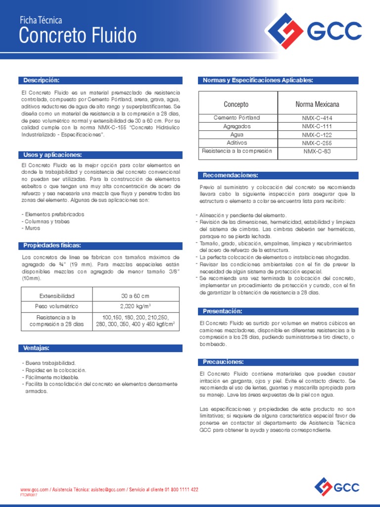 compresión a 28 días 280, 300, 350, 400 y 450 kgf/cm2 El Concreto Fluido es surtido por volumen en metros cúbicos en