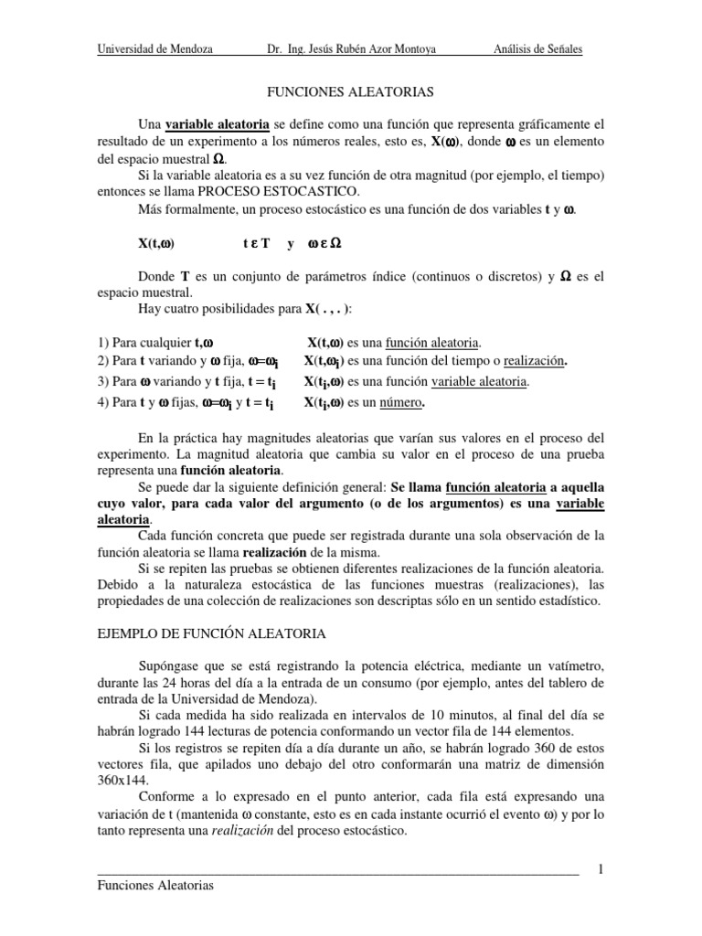 Se puede dar la siguiente definición general: Se llama función aleatoria a aquella