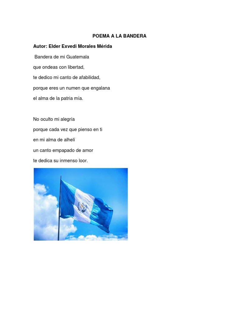 Este poema de 3 estrofas expresa el orgullo y afecto del autor por la bandera de Guatemala. El poema describe a la bandera como un símbolo que engalana el alma de la patria y que inspira alegría y un canto de amor en el autor cada vez que piensa en ella.