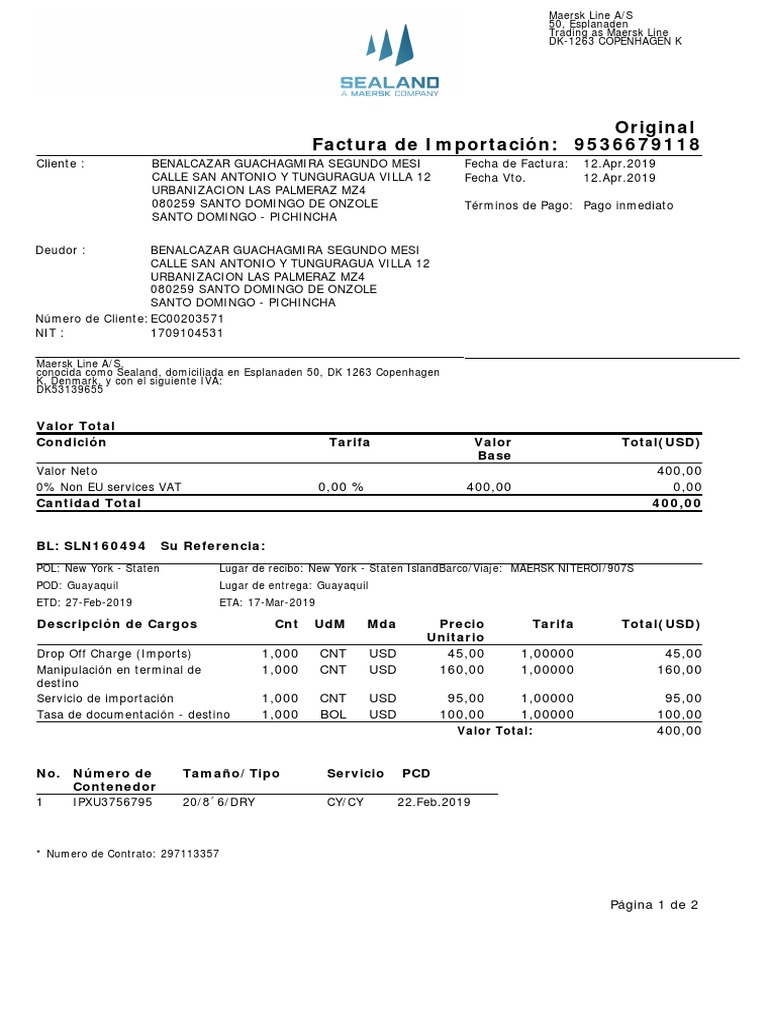 Los pagos deberán realizarse con cheque a la orden de Maersk del Ecuador C.A. – Sealand
