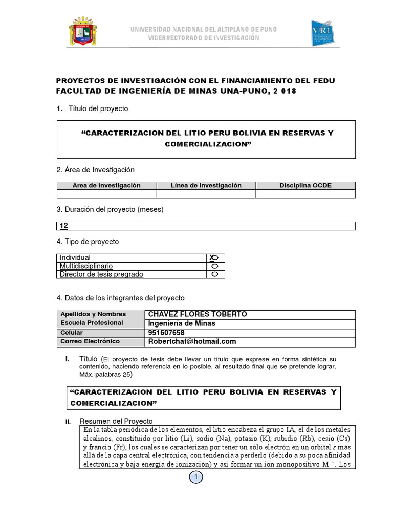 I. Título (El proyecto de tesis debe llevar un título que exprese en forma sintética su