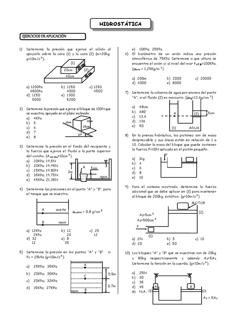 5) Determine la presión en los puntos “A” y “B” si 10) Los bloques “A” y “B” que se muestran son de 20kg