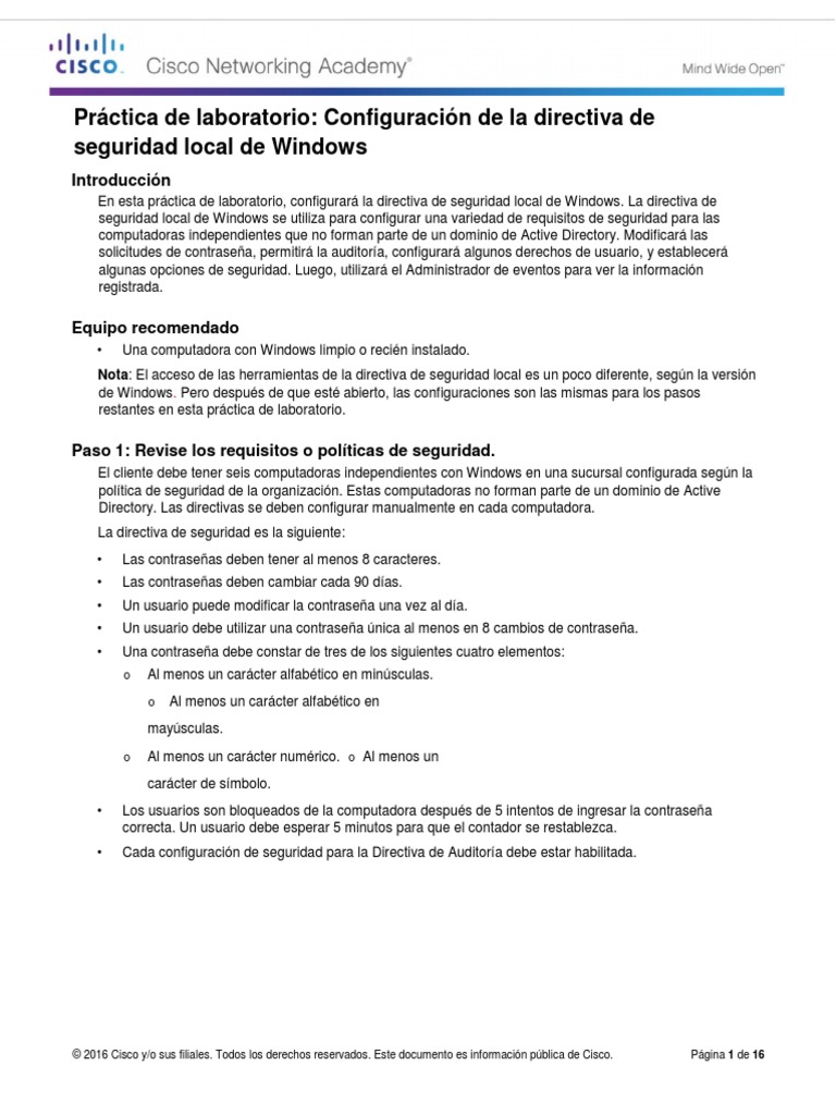 En esta práctica de laboratorio, configurará la directiva de seguridad local de Windows. La directiva de