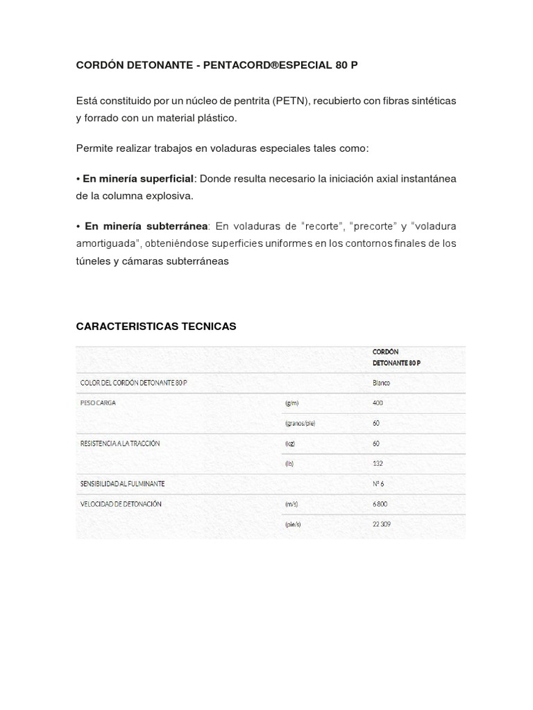 metro de longitud, fabricándose de 1,5; 3 y 5 g/m para iniciar explosivos muy