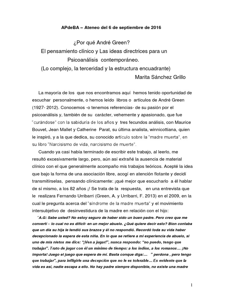 Green . En Green, A. y Urribarri, F. en Del pensamiento clínico al