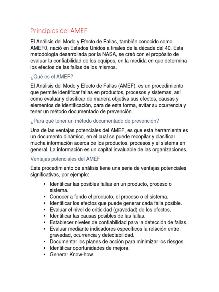 El Análisis del Modo y Efecto de Fallas (AMEF), es un procedimiento