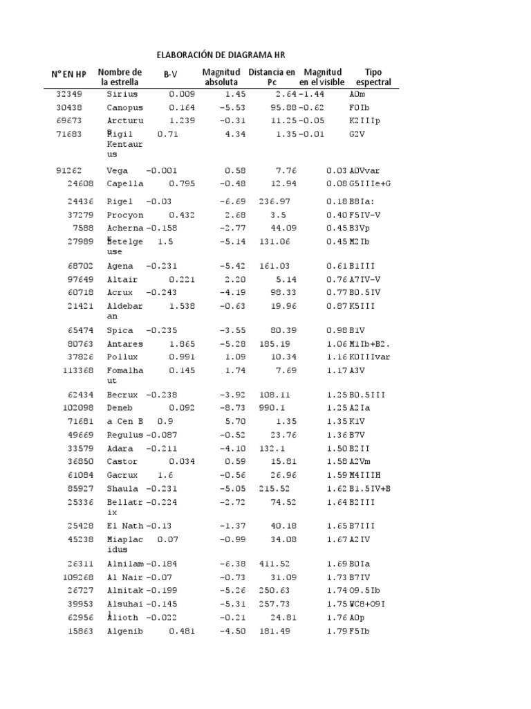 N° EN HP Nombre de B-V Magnitud Distancia en Magnitud Tipo