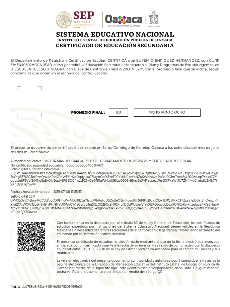 EIHE040502HOCNRFA0, cursó y acreditó la Educación Secundaria de acuerdo al Plan y Programas de Estudio vigentes, en