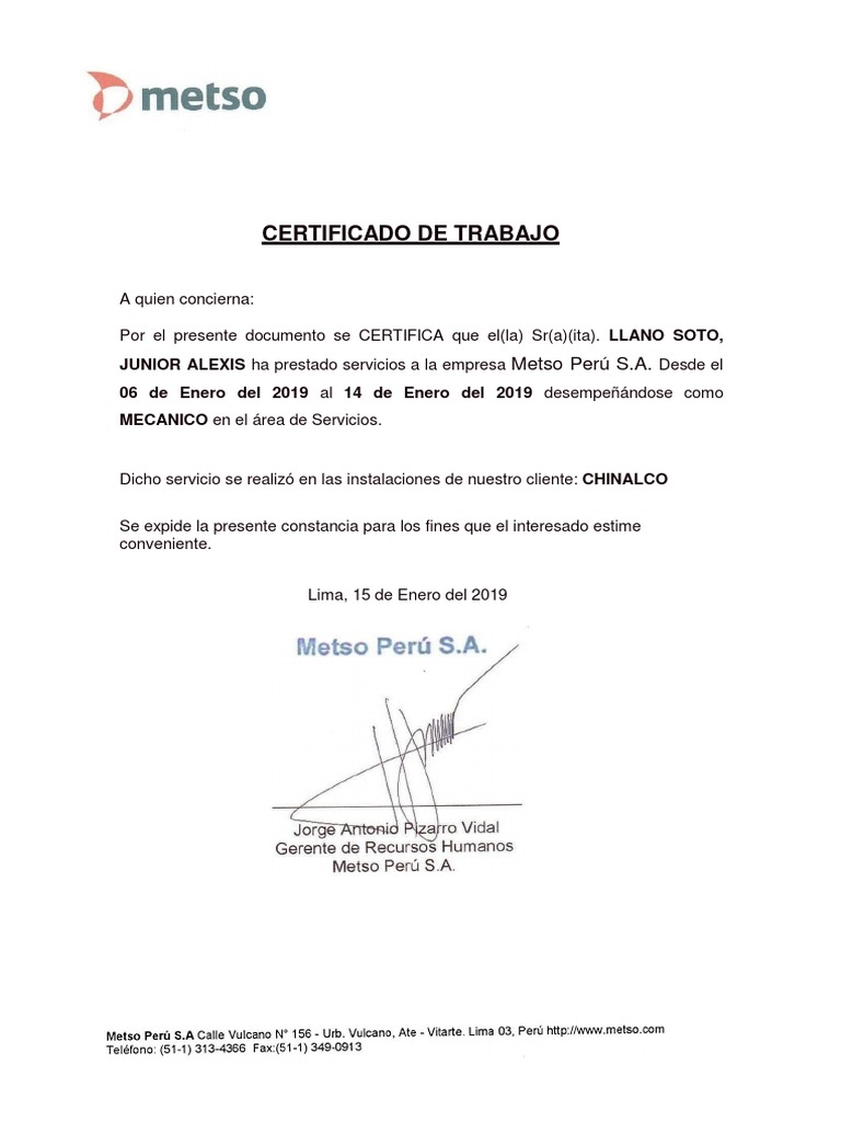 JUNIOR ALEXIS ha prestado servicios a la empresa Metso Perú S.A. Desde el