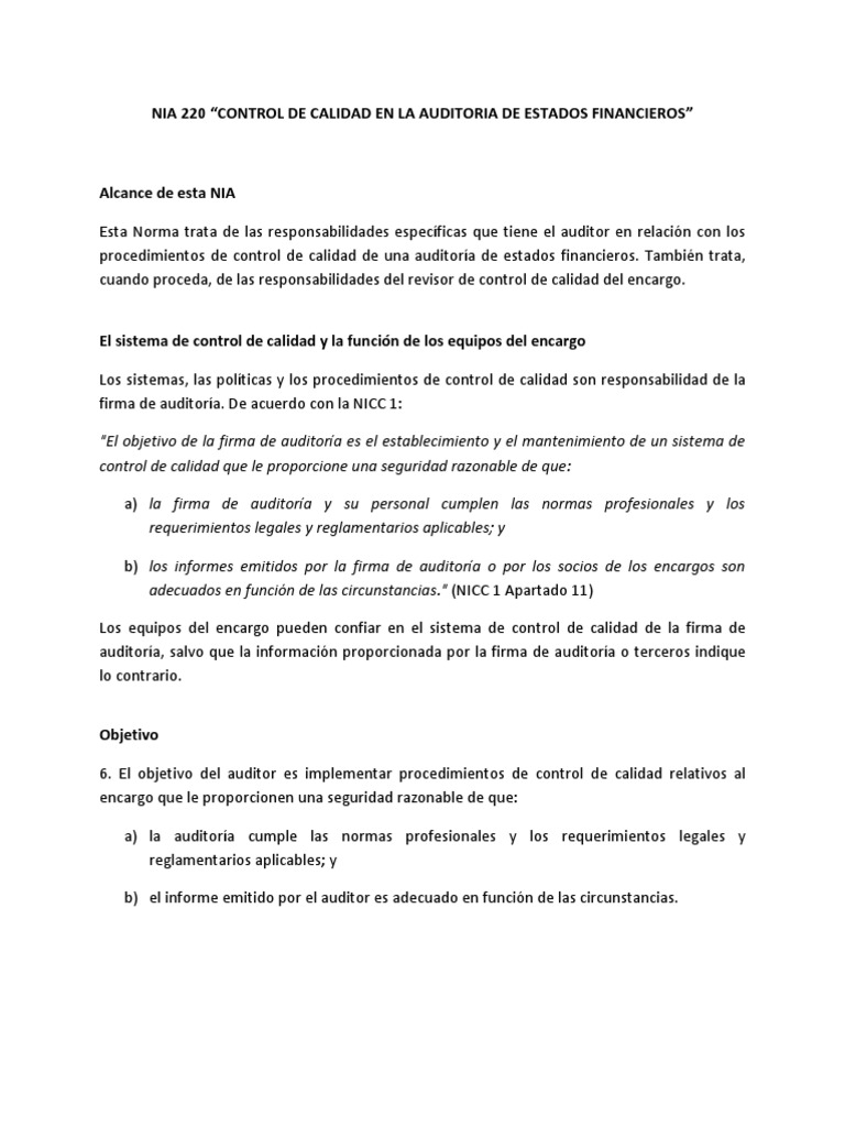 NIA 220 “CONTROL DE CALIDAD EN LA AUDITORIA DE ESTADOS FINANCIEROS”