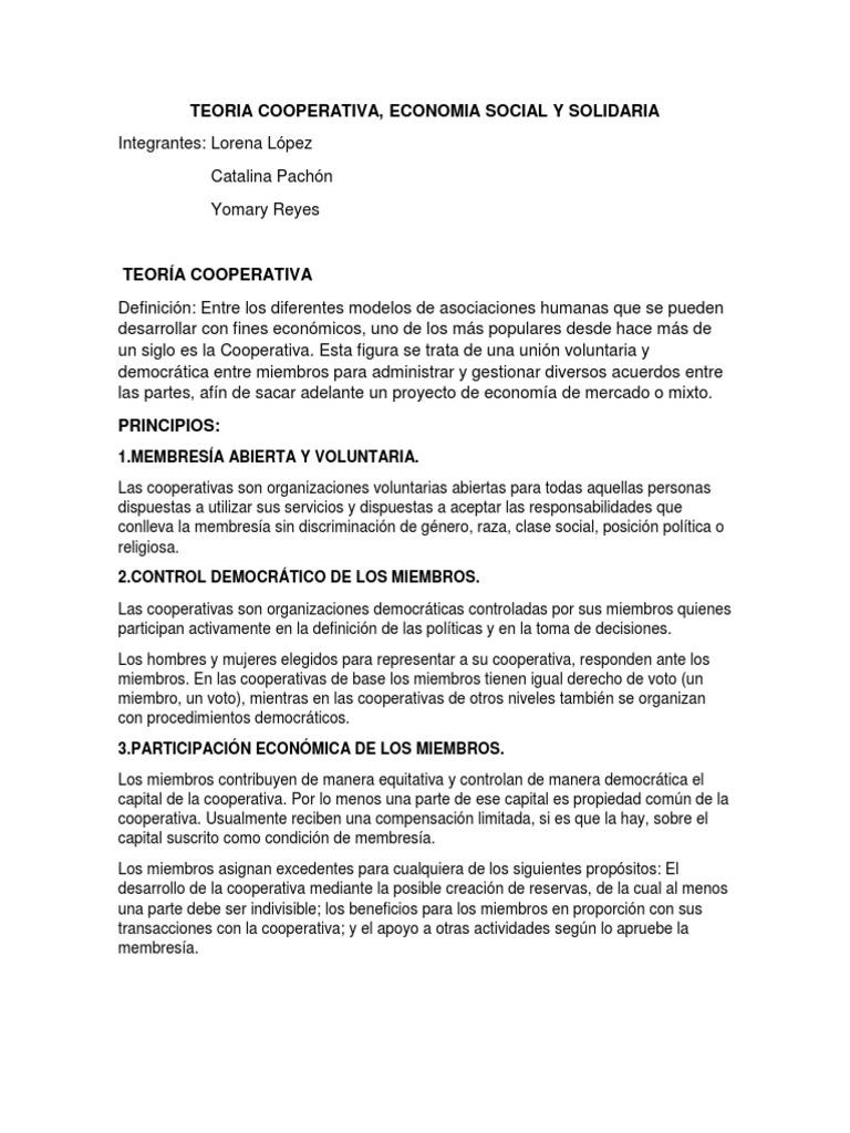 TEORIA COOPERATIVA, ECONOMIA SOCIAL Y SOLIDARIA