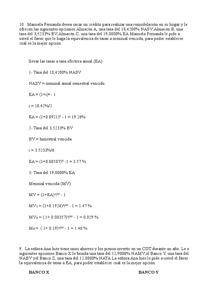 9. La señora Ana Inés tiene unos ahorros y los piensa invertir en un CDT durante un año. Le ofrecen las