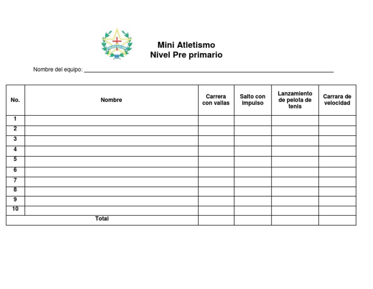 Este documento presenta una tabla con 10 filas para registrar los resultados de los niños en las categorías de carrera con vallas, salto con impulso, lanzamiento de pelota de tenis, carrera de velocidad y lanzamiento para un equipo de mini atletismo de nivel pre-primario.