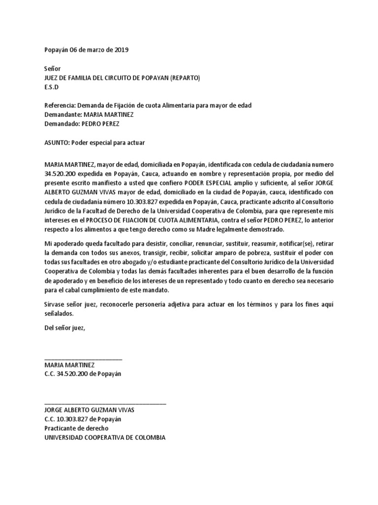 Referencia: Demanda de Fijación de cuota Alimentaria para mayor de edad