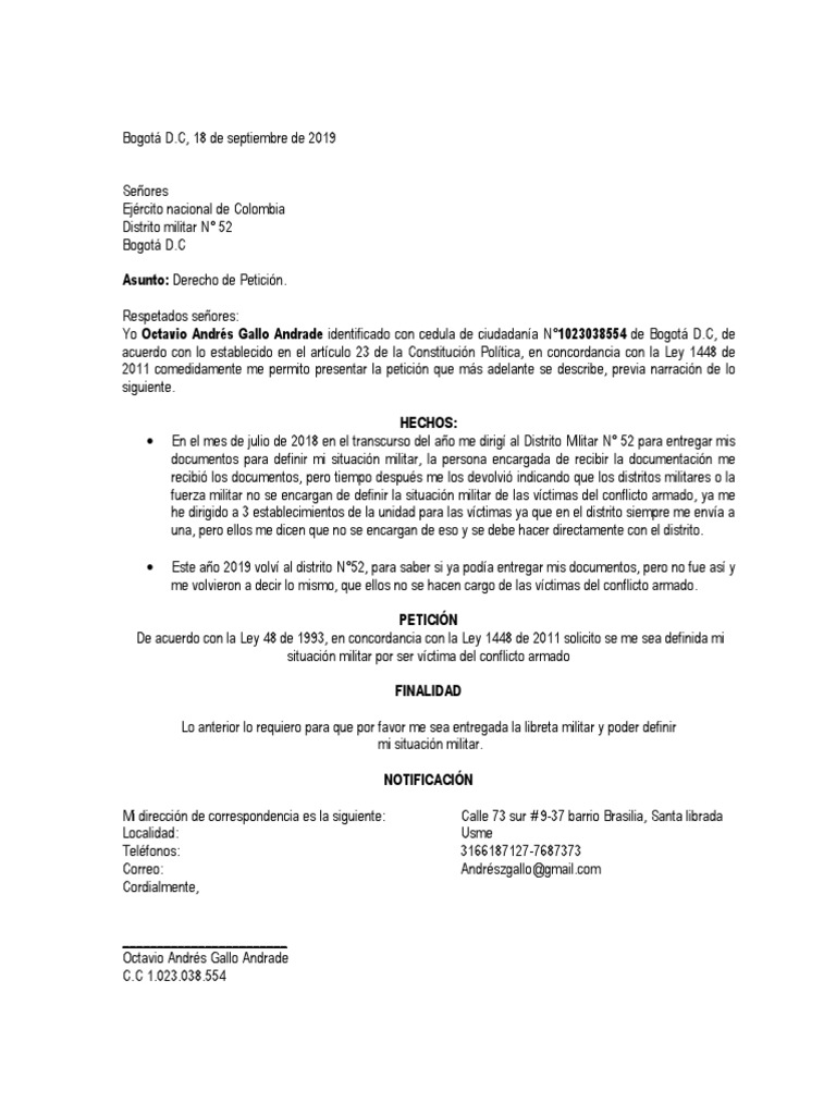 acuerdo con lo establecido en el artículo 23 de la Constitución Política, en concordancia con la Ley 1448 de
