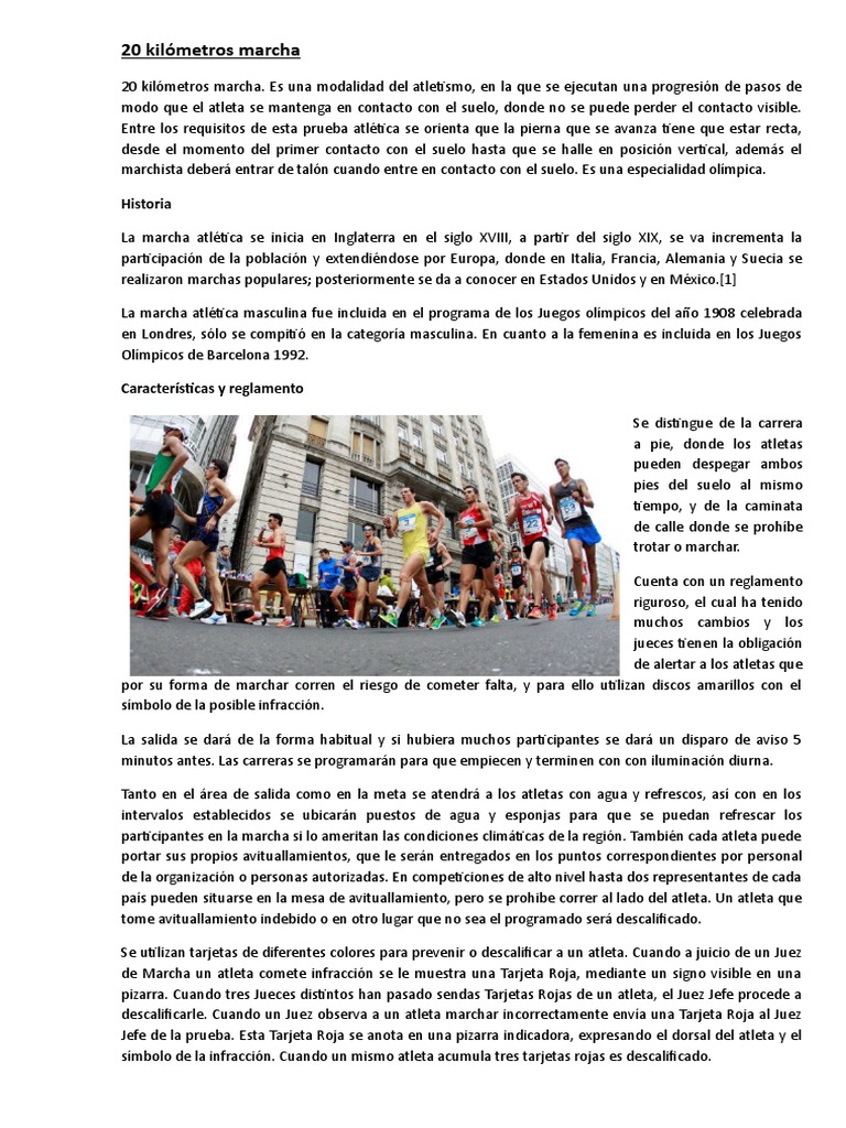 20 kilómetros marcha. Es una modalidad del atletismo, en la que se ejecutan una progresión de pasos de