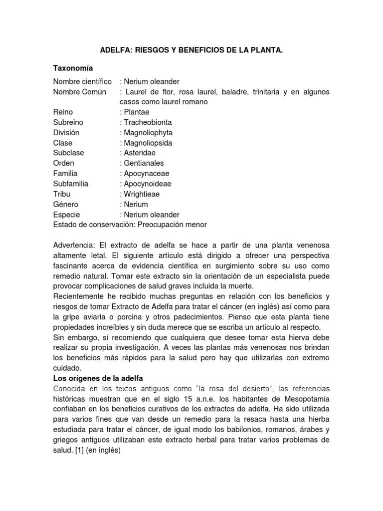 riesgos de tomar Extracto de Adelfa para tratar el cáncer (en inglés) así como para