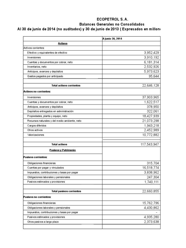 Al 30 de junio de 2014 (no auditados) y 30 de junio de 2013 ( Expresados en millones de pesos col