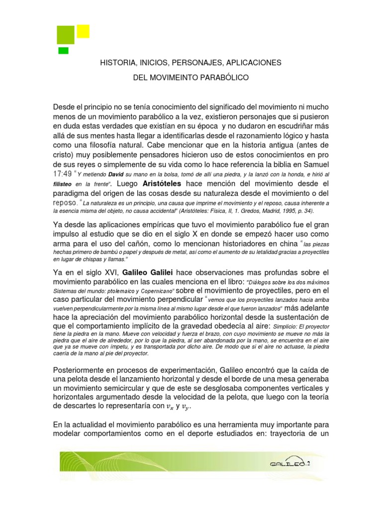 movimiento parabólico en las cuales menciona en el libro: “Diálogos sobre los dos máximos