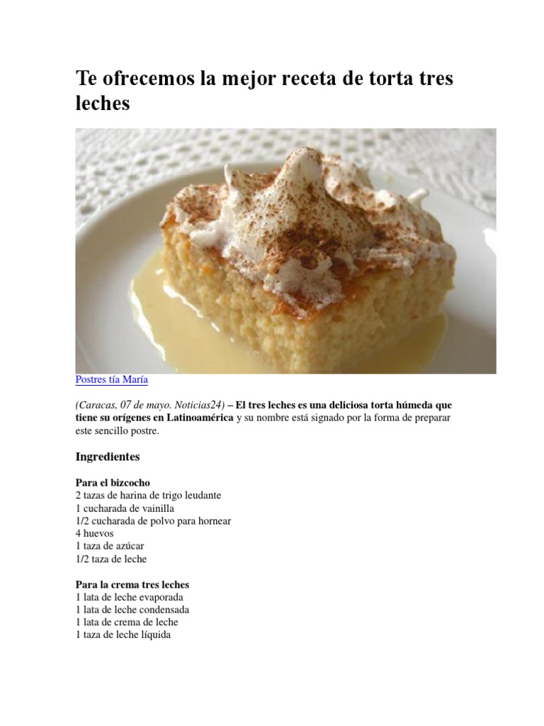 (Caracas, 07 de mayo. Noticias24) – El tres leches es una deliciosa torta húmeda que