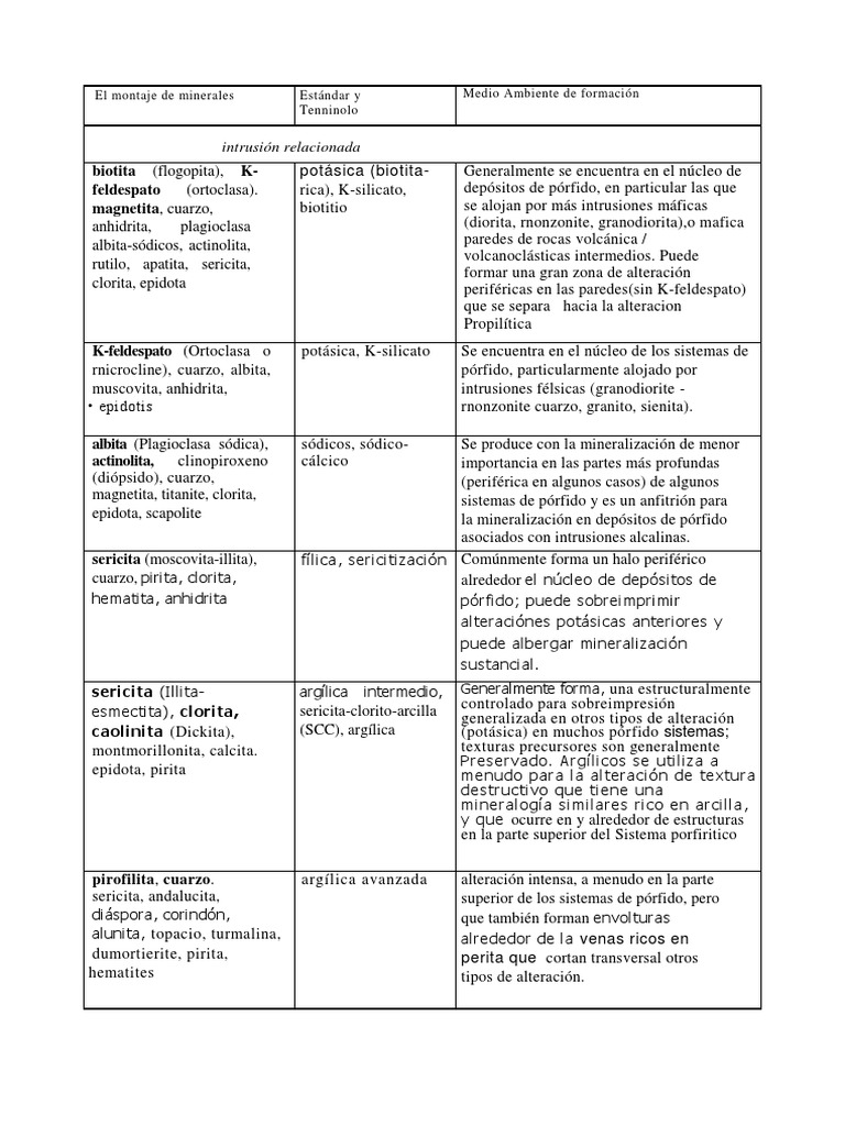 esmectita), clorita, sericita-clorito-arcilla generalizada en otros tipos de alteración