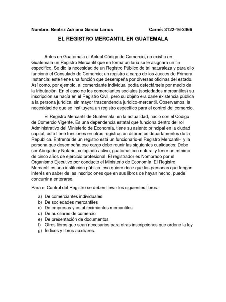 Guatemala un Registro Mercantil que en forma unitaria se le asignara un fin