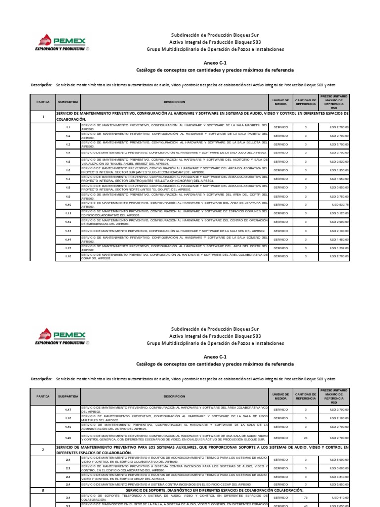 Descripción: Servicio de mantenimiento a los sistemas automatizados de audio, video y control en espacios de colaboración del Activo Integral de Producción Bloque S03 y otros
