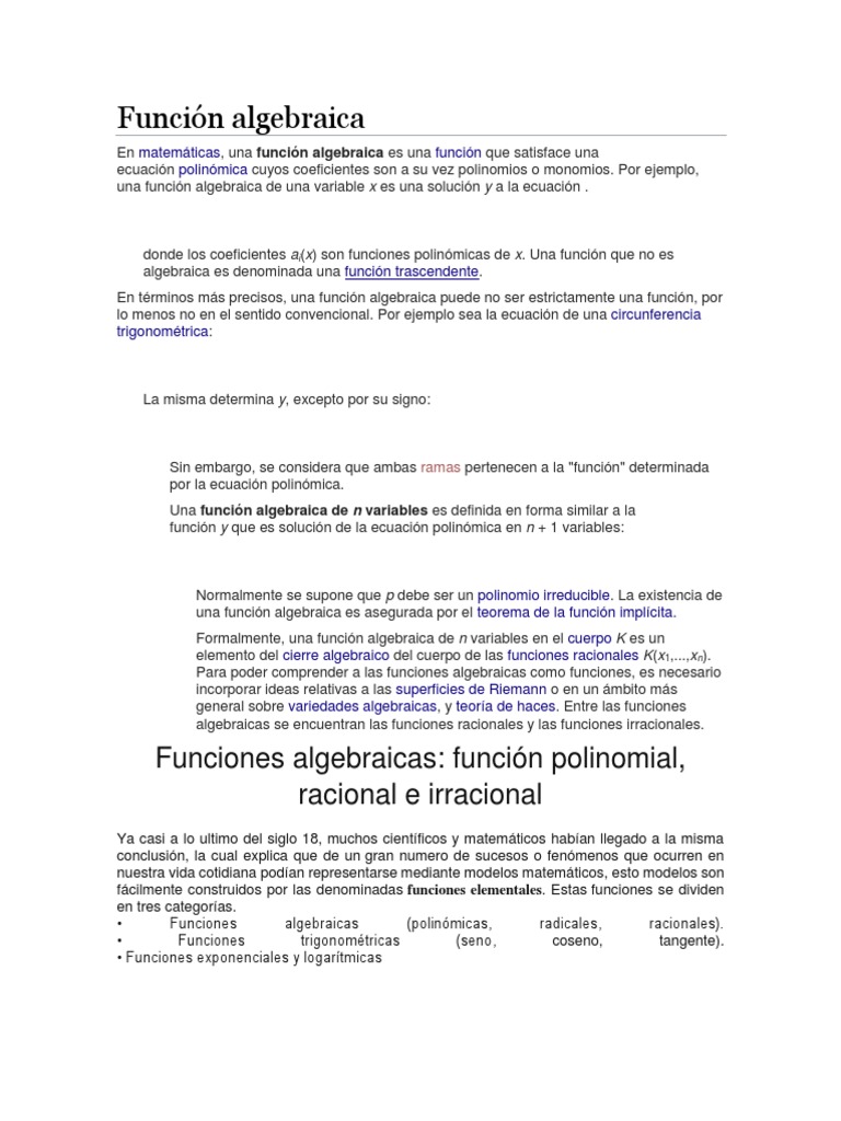 algebraica. Las funciones no algebraicas se denominan trascendentes. Por ejemplo las