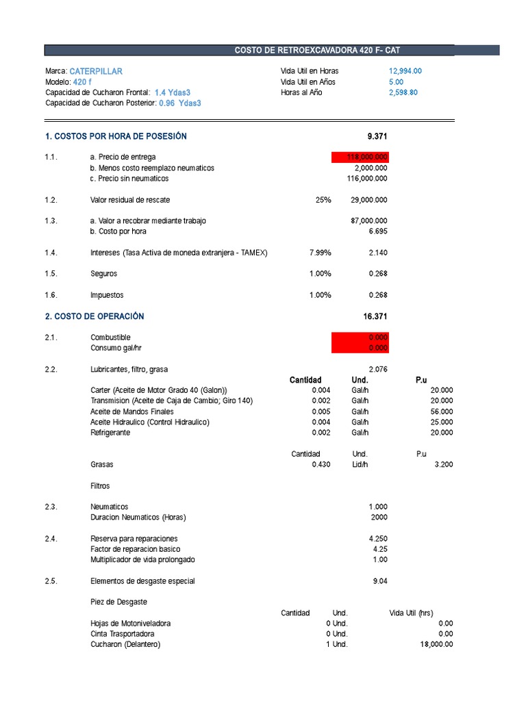 Capacidad de Cucharon Frontal: 1.4 Ydas3 Horas al Año 2,598.80